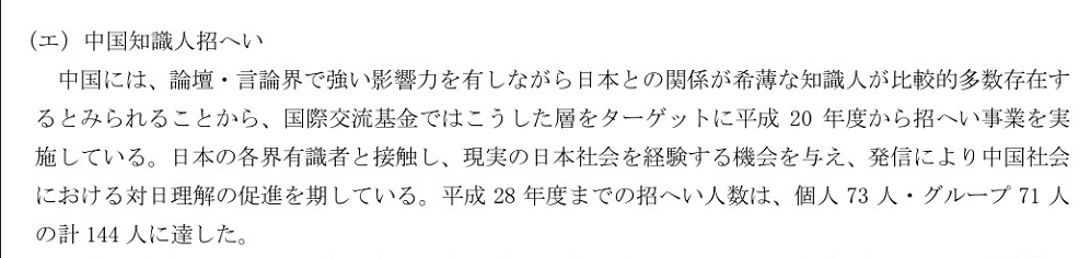 在中國,有相對較多的知識分子,他們在社會輿論和媒體界有較強的影響力,但他們與日本的聯繫並不密切。為此,(日本)國際交流基金從2008年開始實施以這個羣體為對象、邀請他們(赴日參觀考察)的項目。(通過)與日本社會各界精英接觸,給予他們體驗現實日本社會的機會,期待他們發佈相關信息,以促進中國社會對日本的瞭解。截至2016年共有144人被邀請,其中包括73名個人和71名團體成員。