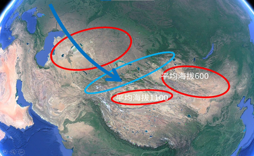 即使有水汽進到中國來,也會發現我們這個地方是盆地,北邊是準噶爾盆地,南邊是塔里木盆地,兩個盆地的海拔都比周圍低,塔里木盆地的平均海拔是1100米,而準噶爾盆地平均海拔只有600多米。