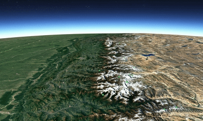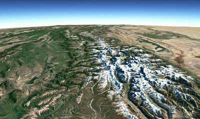 另外看看天山的南北對比,在天山的迎風坡這一面能看得出它比較濕潤,而在背風坡這一面非常乾燥,一片荒蕪。