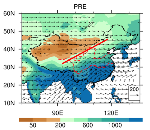 我們做了這樣一個數值模擬,假如只有陸地,但沒有青藏高原,沒有帕米爾高原,沒有這些地形的阻隔,模擬出來的氣候也是這樣,中亞地區降水非常少。