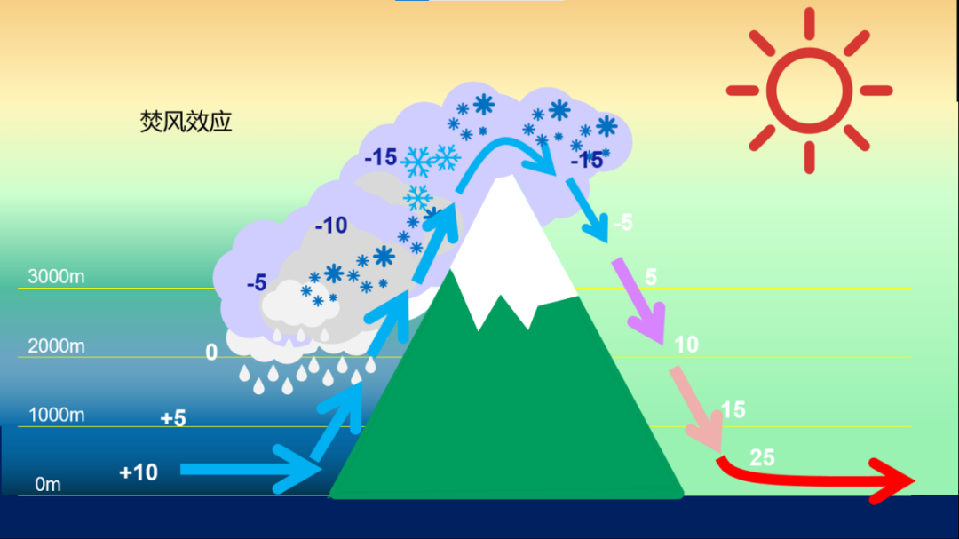 另外一個原因,我們氣象上稱為焚風效應。地球上的水汽分佈滿足比較簡單的物理規律,我們稱之為克拉伯龍-克勞修斯方程,温度越高、距離地面越近的地方,空氣中可以容納更多的水汽;而温度越低、距離地面越高的地方,大氣中的水汽含量就越低。