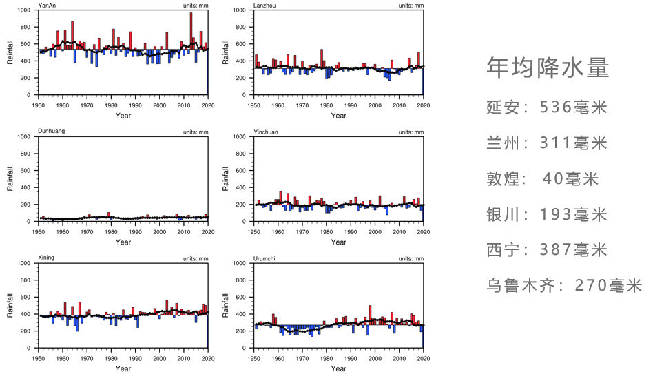 具體的變化怎麼樣,我們也做了一些分析。之所以很多人認為西北正在變得濕潤,是因為他們觀察到西北的降水量有所增加。比如左上方這張圖,是從60年代一直到現在每年降水量的變化。深色這條線曲線表示它的趨勢,我們能看到過去這麼多年的降水量確實有所增加。