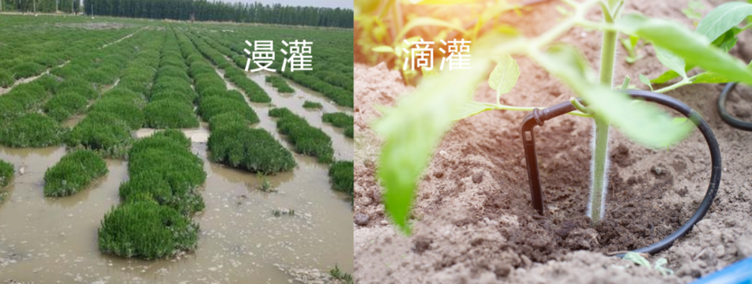 情況肯定不是這樣的,這個地方充滿了希望,我們可以用各種各樣的方式來改變它的生態。比如説即使是在新疆這麼幹旱的地區,很多地方的農業灌溉採用的是像左邊圖這樣的情況,大水漫灌,一個渠把雪山的水引進來,從這頭放進去那頭出來,OK,這片地就澆完了。