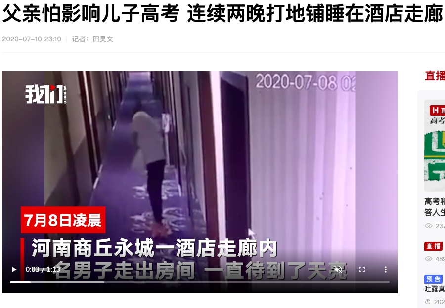 去年高考時,河南商丘一位父親,因為怕自己打呼嚕影響兒子高考,連續兩晚悄悄拿着一塊浴巾睡到走廊上。