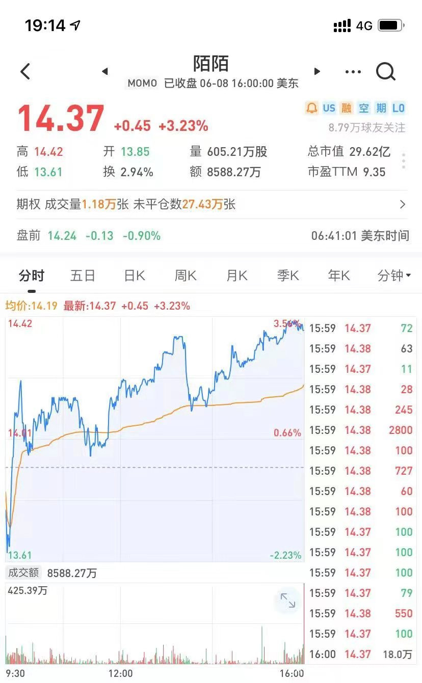 超預期的財報令陌陌獲得了資本市場的認可。2021年6月8日,財報發佈後,陌陌收盤於14.37美元/股,收盤上漲3.23%,在中概股一片低迷的表現中頗令人矚目。