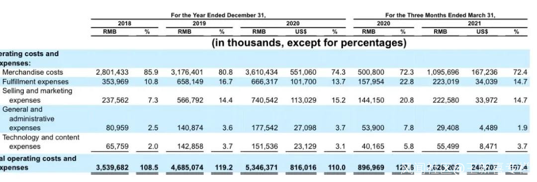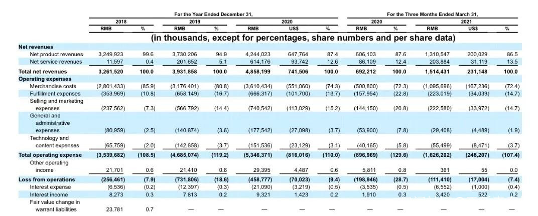從它近49億的營收構成來看,分為自營商品收入和平台收入,2020年分別為42.4億和6.1億。可以看出其營收構成中,核心是依賴自營商品收入。