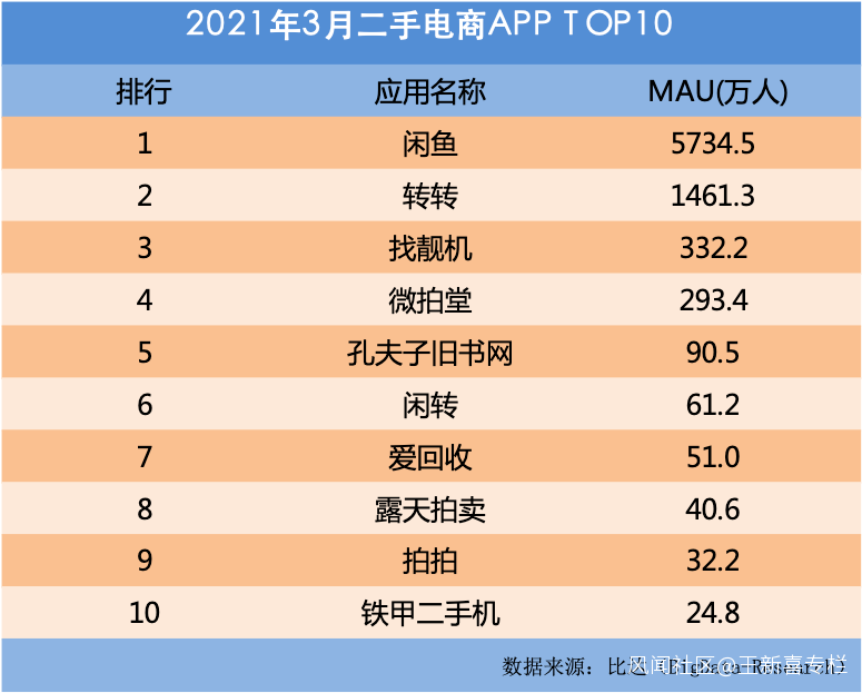 根據比達統計數據顯示,2021年3月二手電商APP的月活人數統計,閒魚是5734.5萬人,轉轉是1461.3萬人,佔據整個市場的88%左右;愛回收、拍拍月活分別是51萬與32.2萬,約為閒魚和轉轉的零頭。