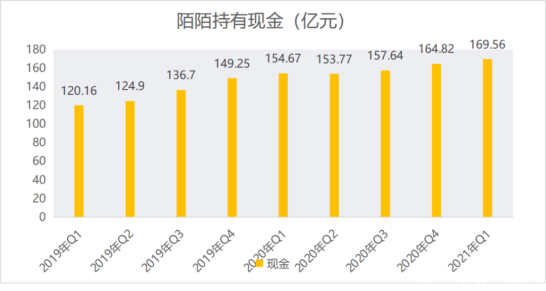2021年一季度,陌陌經營活動產生的淨現金為5.016億元,截至2021年3月31日,其持有的現金、現金等價物、短期存款、長期存款和限定性現金為169.560億元,相比2020年末的164.823億元,增厚4.677億元。