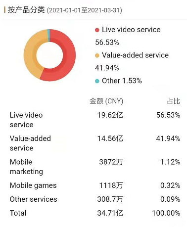 如上圖所示,2021年一季度陌陌的營收結構中,直播服務業務和增值業務,前者佔比56.53%,後者佔比41.94%,差不多已到了旗鼓相當的地步。