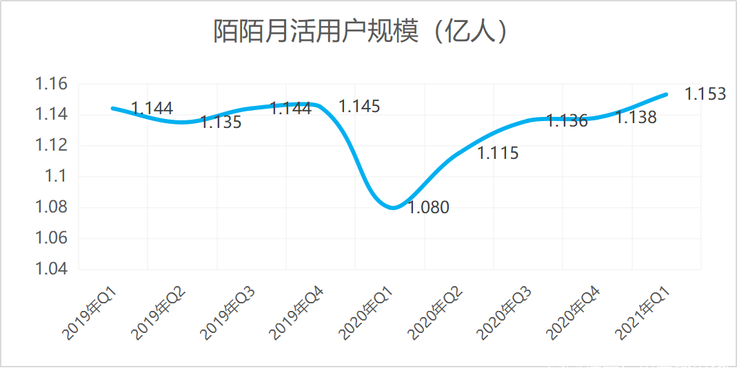 截止2021年一季度末,陌陌主App月度活躍用户1.153億,較2020年末的1.138億增長7%,反季節增長並創歷史新高。