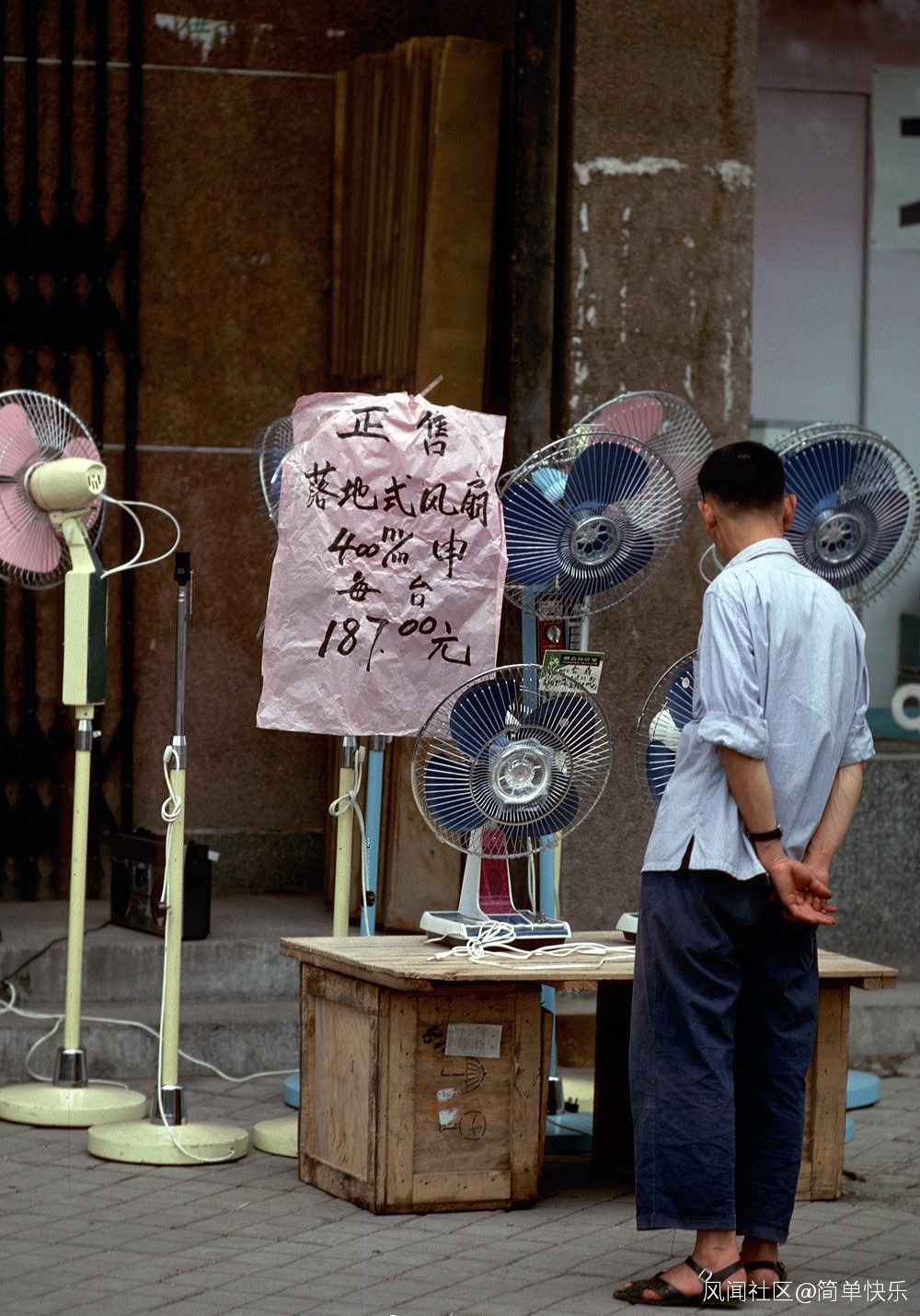 這是80年代初一個外國人在街頭拍的照片。一台電風扇標價187塊錢,這太離譜了吧,當時普通人一個月工資才三十塊,這相當於現在1萬塊錢一台了吧?