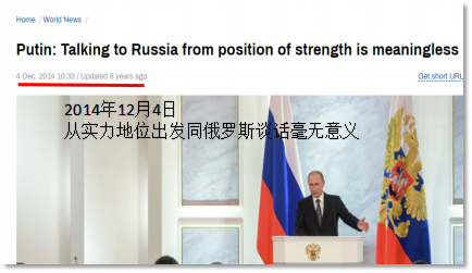 從普大帝反應看,應該是美國官員説過什麼“美國從實力地位出發同俄羅斯對話”。接着在2015年、2016年都有美英政客或北約闡述類似話語。2017年特朗普上台後,北約秘書長斯托爾滕貝格在2017年1月31日野説,北約和美國新政府一致認為,有必要“從實力的立場”與俄羅斯進行對話。不過在後續特朗普當政期間這個句式幾乎消失不見,顯然特朗普不習慣奧巴馬這個的調調。