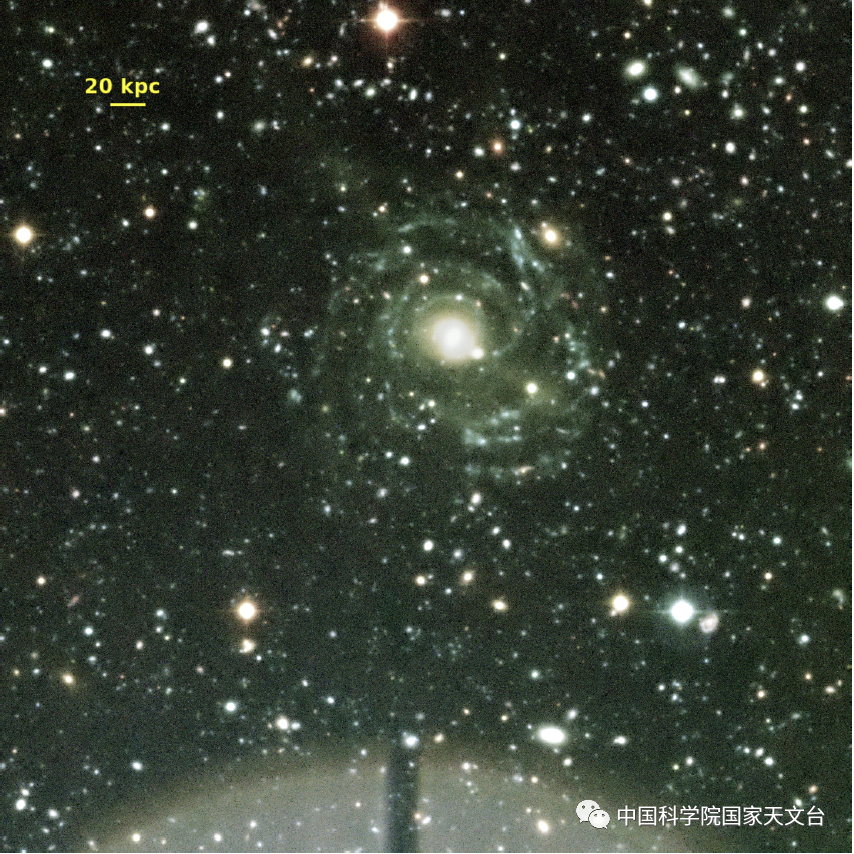 人類歷史上發現的第一個低表面亮度星系Malin 1(Bothun et al. 1987)就是一個低表面亮度的巨型星系(LSB giant)。圖4展示的是Malin 1,這幅圖是用位於夏威夷的Mauna Kea天文台的3.6米口徑的CFHT 望遠鏡對Malin 1所在的天區,在光學u,g,i,z四個波段進行長時間曝光(u: 6402秒,g: 3170秒,i: 2055秒,z: 3850秒),併疊加這四個波段圖像所產生的深度圖像(Boissier et al. 2016),我們能從中清晰地看到Malin 1的旋臂和延展的星系盤。