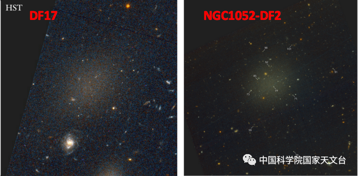 圖3. 超彌散星系DF17(左圖中心位置)和超彌散“暗物質缺失”星系NGC1052-DF2(右圖中心位置)。左右兩圖不在相同的物理尺度下(圖源:左圖來自van Dokkum et al. 2015, 右圖來自van Dokkum 2018)
