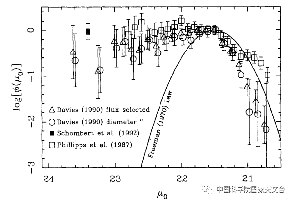 LSBG的“脱穎而出”頗為曲折。早在1970年,天文學家Freeman對36個漩渦星系和透鏡星系開展測光研究,發現其中28個星系的中心面亮度集中在μ0=21.65± 0.30 mag/arcsec2,從而得出Freeman Law:所有盤狀星系的中心面亮度是一致的常數μ0(Freeman 1970)。言下之意,宇宙中沒有星系的中心面亮度比μ0亮,也沒有星系的中心面亮度比μ0暗。