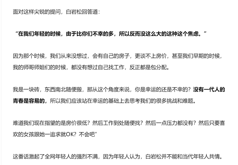 另一個火力點在於,白老師提到“包分配”的事情,先説到他們那個年代沒想過自己買房子,也沒想過自己選工作,那會年輕人沒想那麼多東西,因為“房子住單位,畢業包分配”,語氣裏透露着對那個無自由選擇的時代的不滿,當然,你們現在時代這麼好,卷一點怎麼了?這讓年輕人覺得他得了便宜,賣乖就大可不必吧,可他確實做到了。