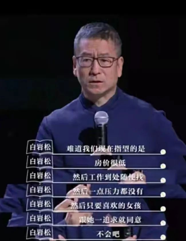 而白老師“不會吧”這一問,要麼可能是他太不瞭解當下很多年輕人的生活現狀,似乎沒有親身體會過當代年輕人“望樓興嘆”的無力、“福報加班”的無望、“相親循環”的無奈,同時,也反映了他的政治意識不過關,不明白我們當前的主要矛盾是什麼,所以才觸動到了當下年輕人最敏感的神經,那是他們對房子、工作、配偶本是無能為力但卻又充滿美好生活的需求,而這一問好似當頭潑涼水;要麼可能就是他心裏門清,作為每天工作在新聞口的人物,對這個年輕人真正想問什麼心知肚明,但這類人説某些話,未必是説給在座年輕人聽的。