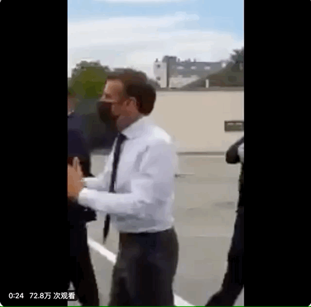 當時馬克龍正準備離開,上車之後又很快下車和圍觀的羣眾打招呼。前去和現場羣眾握手時,被圖中身穿綠色衣服的長髮男子扇了一巴掌。男子行動之前,喊了一句“Montjoie Saint-Denis,打倒馬克龍”(“Montjoie Saint-Denis, à bas la Macronie”)!據悉,這是12 世紀卡佩王朝為法蘭西王國而戰的口號。從那時起,它已成為極右翼的標誌。