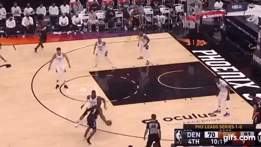 到下半場,保羅忽然開始連續突破分球。吊艾頓空接,給底角布里奇斯,給右翼布克,喂布里奇斯快攻,一波打崩了掘金,收工。