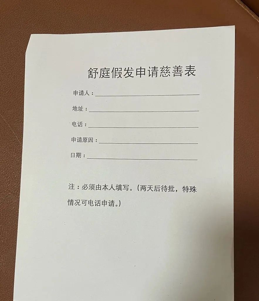 店裏還有個規矩,患癌的客人,如果是低保户,或者月收入低於3000,可以免費送一頂假髮。如果不屬於這兩種情況,但經濟確實困難,填一張表格,也可以申請補助。