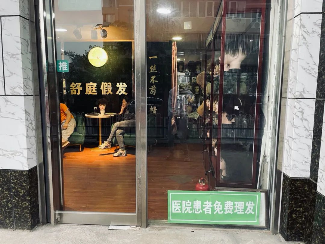 在舒庭假髮店裏,貼着這樣一些標語:“醫院患者免費理髮”、“特別貧困的醫院患者,買假髮需要救助的,請聯繫舒庭假髮愛心驛站”。