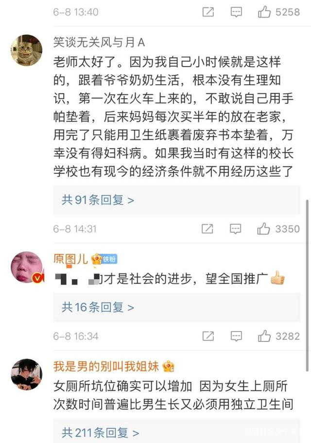 另一位網友説:“老師太好了。因為我自己小時候就是這樣的,跟着爺爺奶奶生活,根本沒有生理知識,第一次在火車上來的,不敢説,自己用手帕墊着。後來媽媽每次買半年的放在老家,用完了只能用衞生紙裹着廢棄書本墊着,萬幸沒有得婦科病。如果我當時有這樣的校長,學校也有現今的經濟條件,就不用經歷這些了。”
