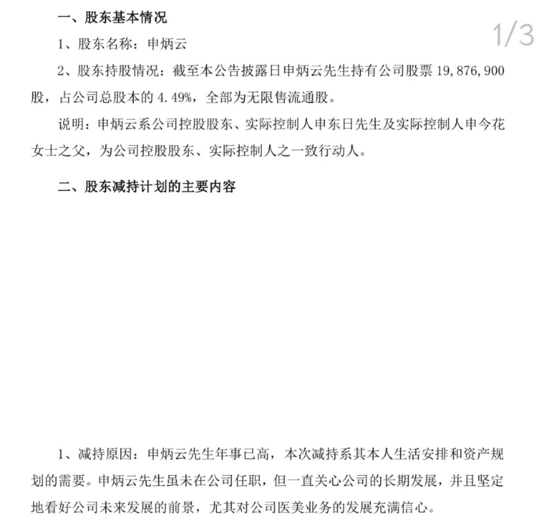 比如在減持公告裏寫這麼一句:“堅定地看好公司未來發展的前景,尤其對公司醫美業務的發展充滿信心。”