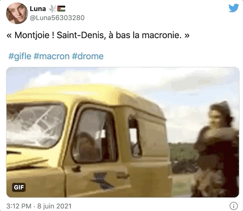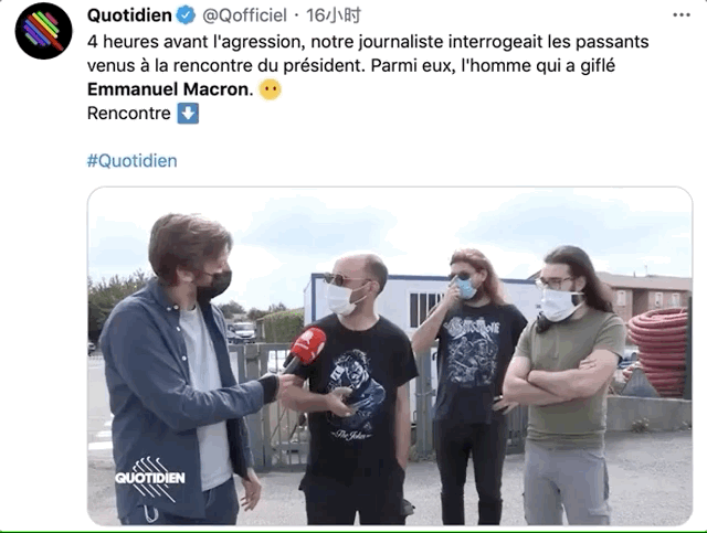 然而就在這個時候,這名男子假意握手,高喊着口號:**“Montjoie Saint-Denis(一個保皇主義的口號), à bas la macronie.(打倒馬克龍)”**狠狠對馬克龍甩了一巴掌!