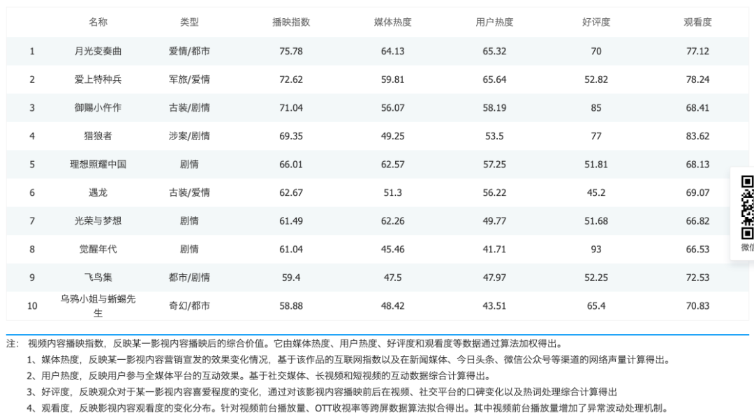 目前各類第三方網播數據平台都有一個綜合指數,這個指數多是綜合了播放平台熱度(播放量)、社交網絡熱度、媒體熱度、好評度等多方面得出的。但相比這些算法複雜的指數,有效播放量或者播放時長顯然更為直觀和有價值。