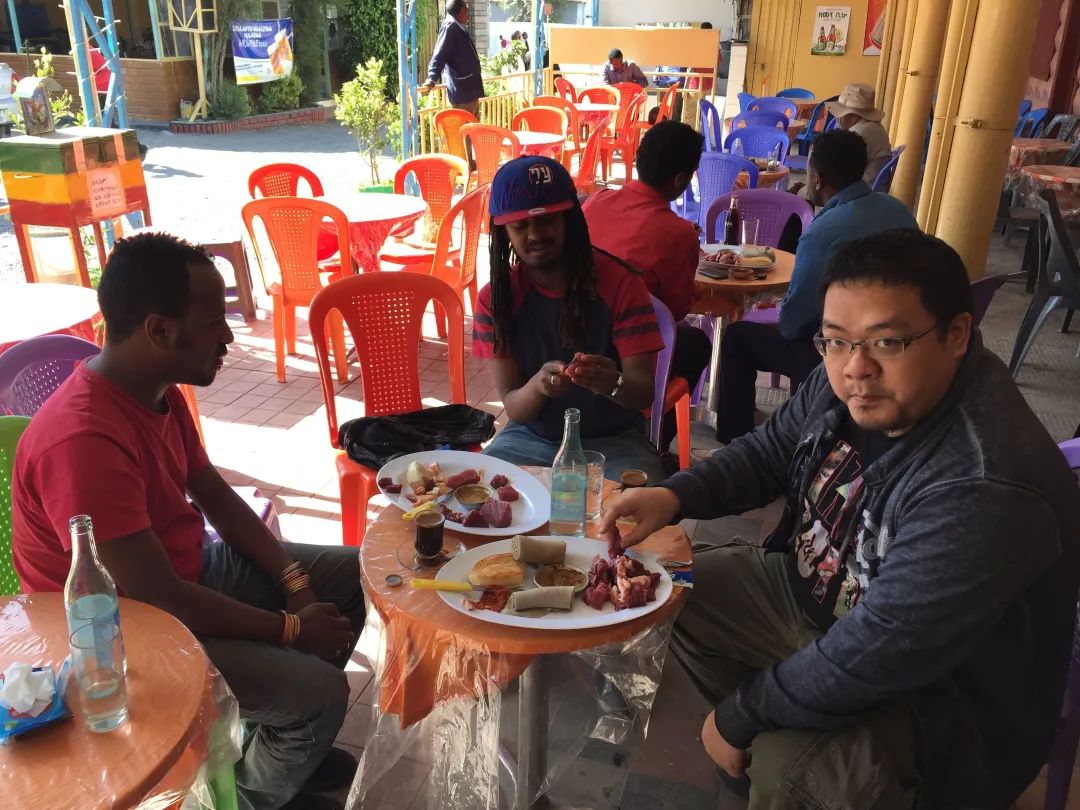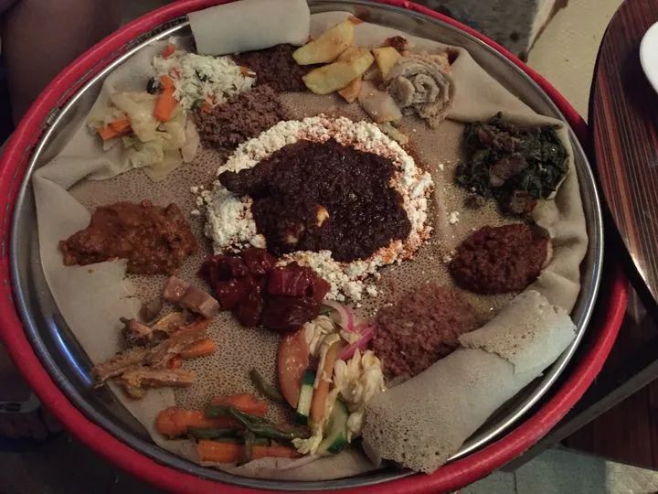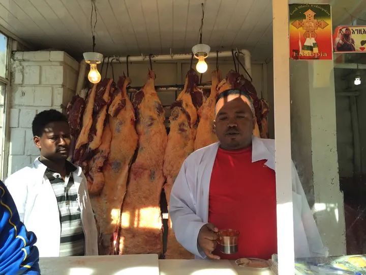 埃塞的國菜是生牛肉,直接從肉鋪裏掛着的半扇兒牛上面給你連肥帶瘦割下來兩斤,然後沾着辣椒粉用英吉拉卷着吃: