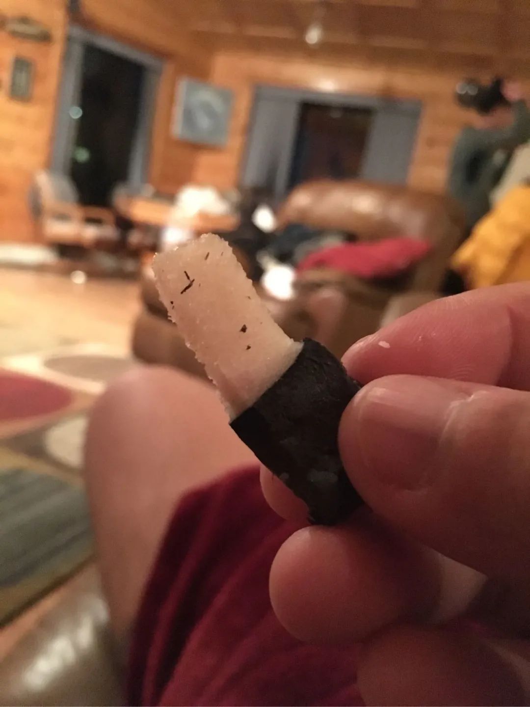 醃鯨魚皮就成了飯前的零嘴兒,皮膚的厚度就跟我一個指節一樣,下面的白色則是脂肪: