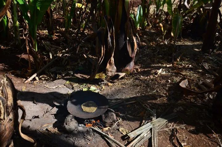 到了農村,主食變成了類似芭蕉樹的根部(名字叫ensete),磨碎,埋在地裏發酵,之後烤的餅子: