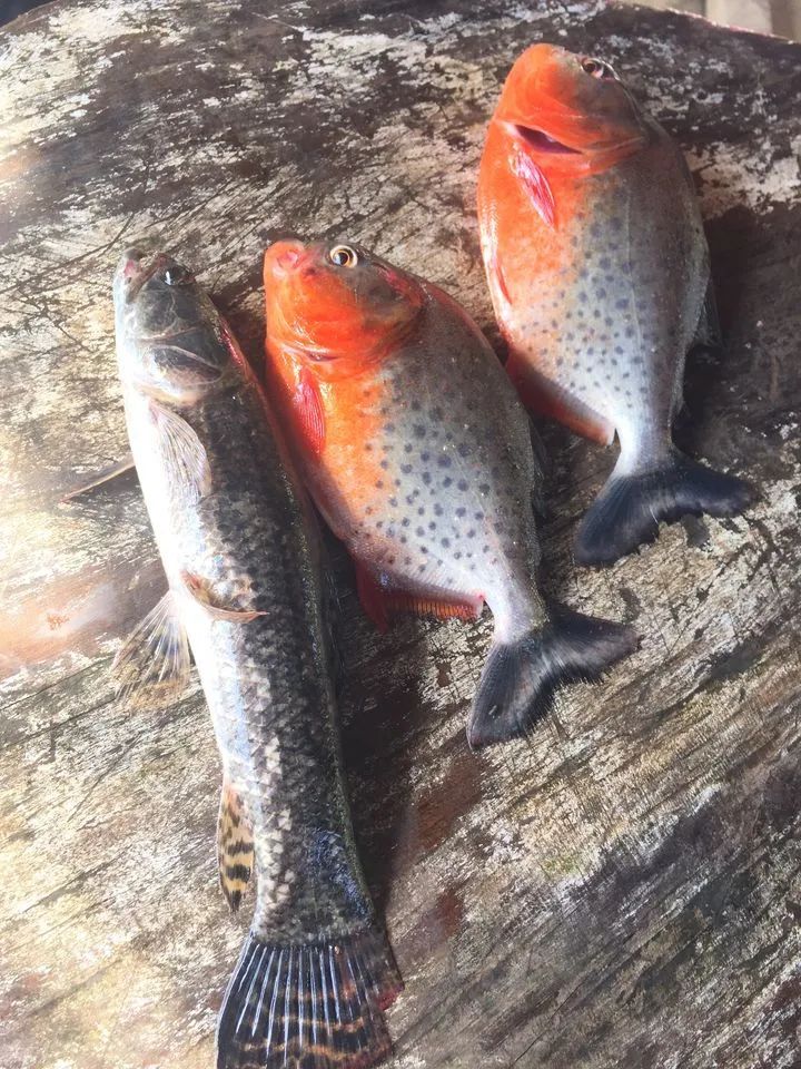 住在叢林裏,午飯殺了只雞烤了吃,下午划着獨木舟,用剩下的雞皮當魚餌釣食人魚,然後食人魚油煎了就是晚餐: