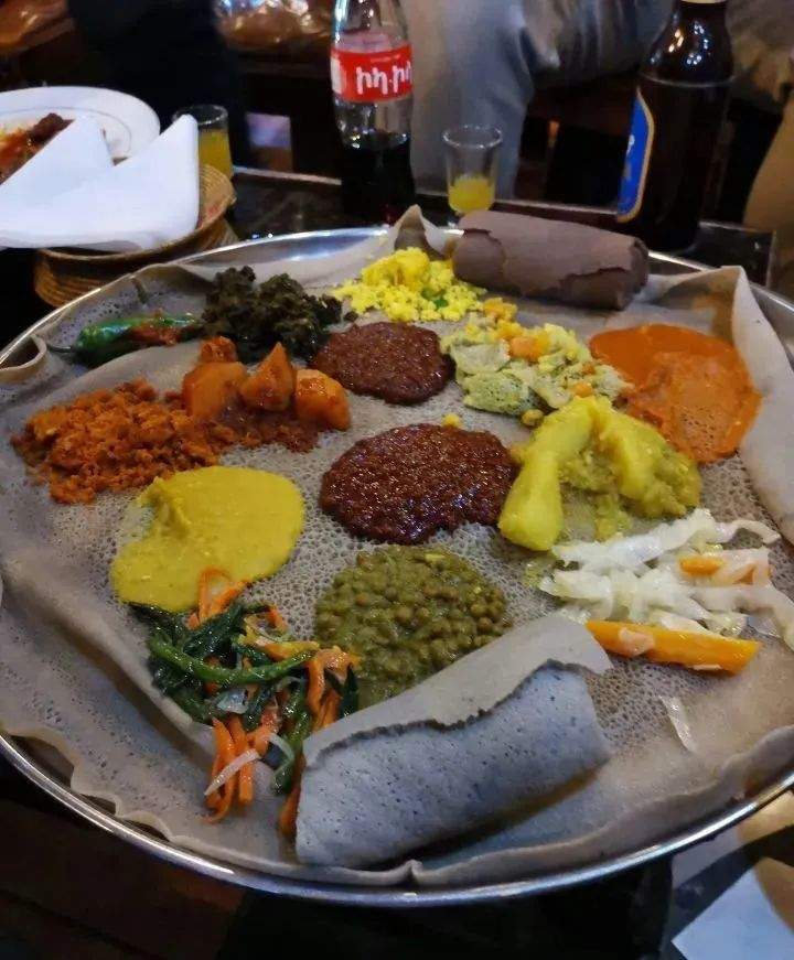 埃塞俄比亞的主食叫做英吉拉,苔麩發酵而成的酸味薄餅,樣子和手感都像抹布,卷着各種糊狀的菜吃進嘴裏頗有種擦完桌子把抹布吃了的錯覺: