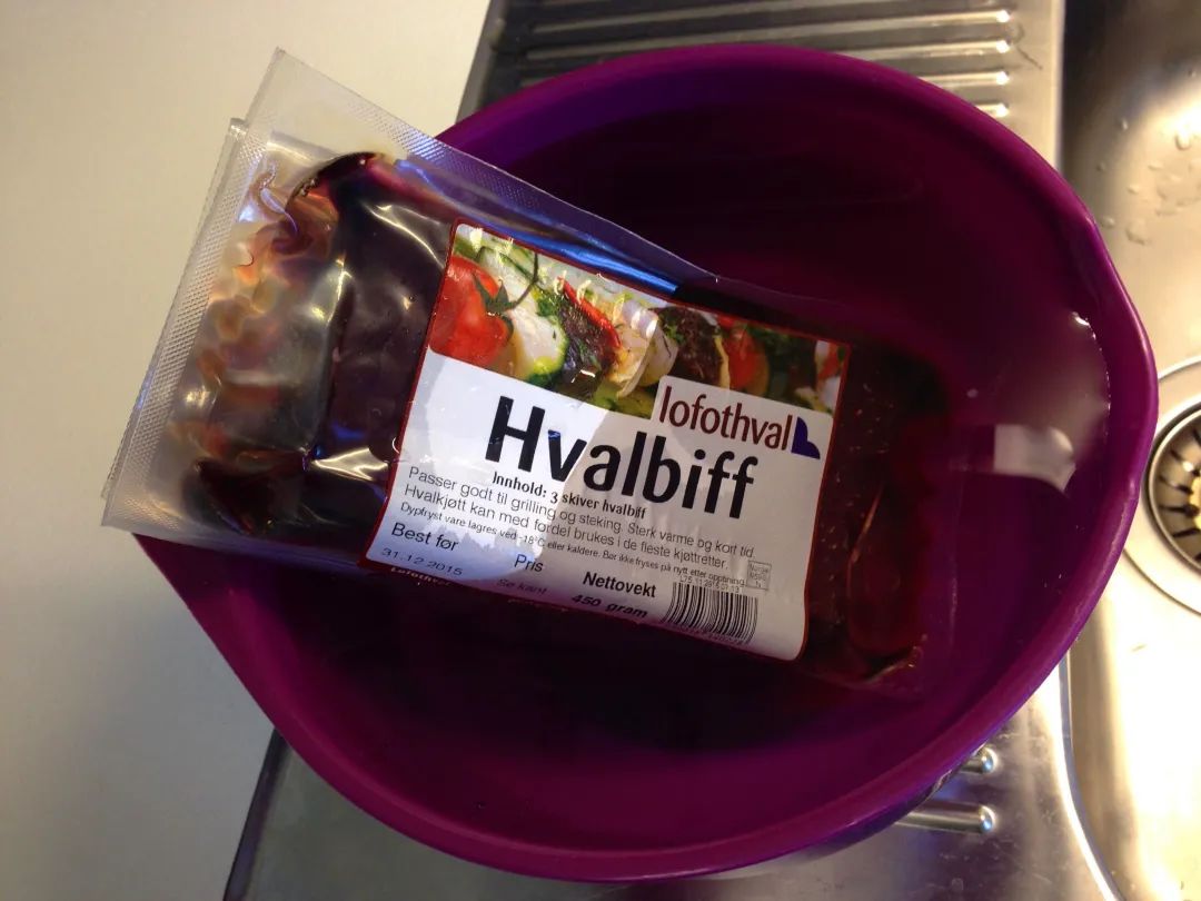 挪威北部,超市裏買上一塊鯨排,再炒上幾個菜捲餅吃: