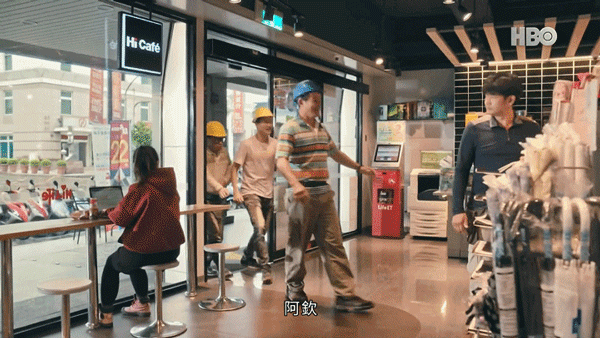 阿祈三人走進便利店,阿昌本能地把髒兮兮的靴子脱掉,躡手躡腳地踩着襪子進去。