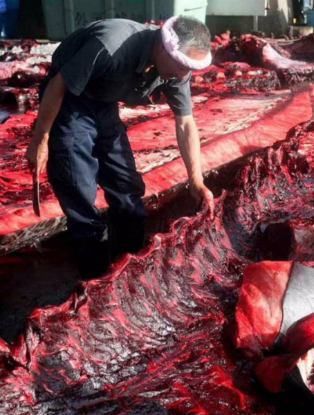 海豚的肉被割下來以低廉的價格賣給廠商,再偽裝成高級鯨肉出售,沒人知道到底吃的是什麼。