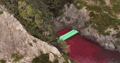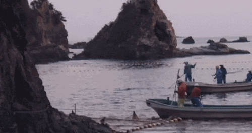 漁民們手持長矛刺向海豚,血液頃刻間染紅了海水。