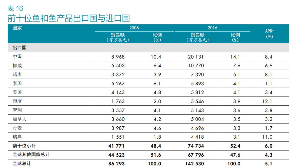 自2002 年起,中國就成為了全球最大的水產品出口國,並且蟬聯至今。
