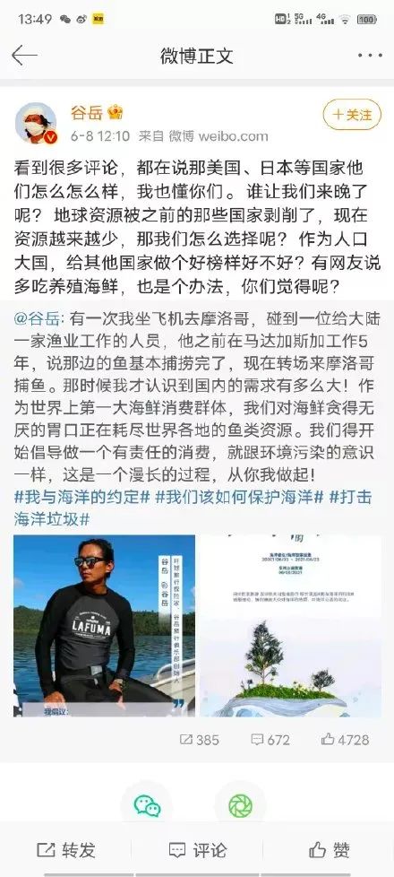 一個叫谷嶽的旅行博主呼籲“貪得無厭”的中國人應該少吃海鮮,因為吃海鮮會耗盡世界魚類資源。