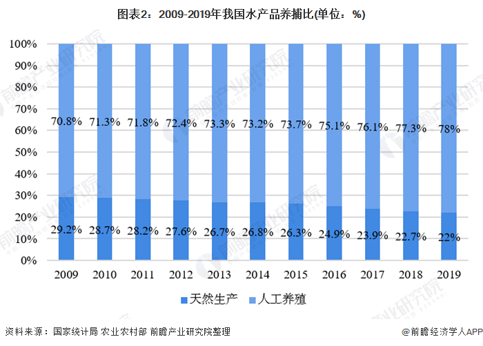 1988年,中國的水產養殖產量首次超過野生捕撈的產量。自此之後,養殖產量佔比逐年攀升。