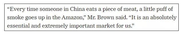 後有美國一人造肉公司老闆説,中國人每吃一塊肉,亞馬遜叢林就升起一縷煙。