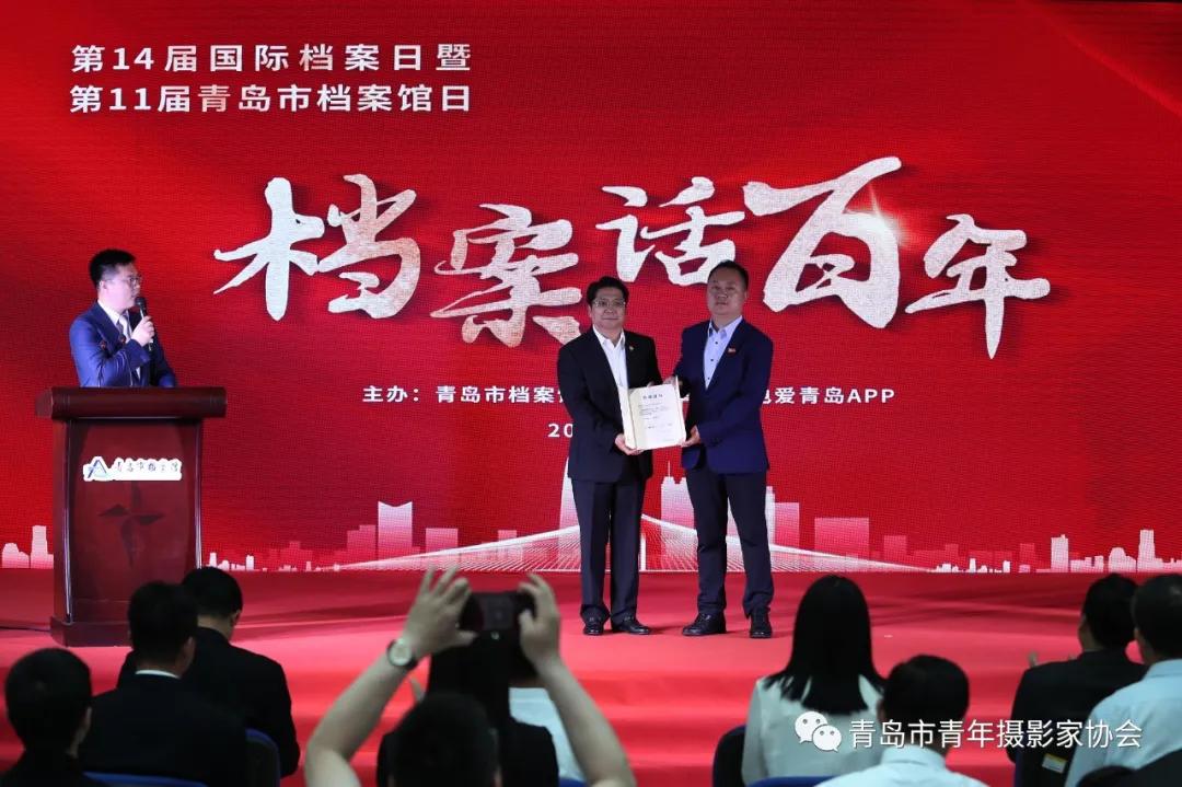 青島市檔案館館長姜永河代表青島市檔案館向青島市青年攝影家協會頒發《青島市檔案館收藏證書》,以致謝忱。