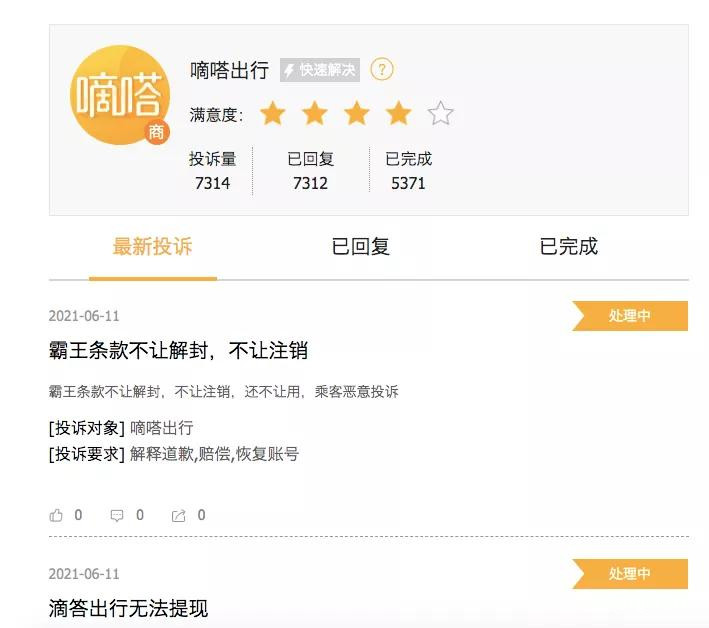 而面對順風車的種種問題,嘀嗒出行的服務並沒跟上。新浪黑貓投訴顯示,涉及嘀嗒出行的投訴案高達7314個,多涉及順風車司機惡意加價取消訂單、車主管理混亂、服務態度惡劣,針對嘀嗒出行客服“投訴不受理”的批評也不在少數。