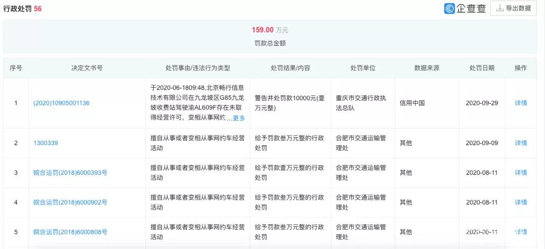 在監管約談背後,嘀嗒出行已經屢次被罰。企查查信息顯示,嘀嗒出行已經被行政處罰56次,僅在2020年年內,嘀嗒出行共計領到45張罰單,處罰單位涉及重慶、合肥、北京等地交管部門,被罰原因主要為“擅自從事或者變相從事網約車經營活動”。