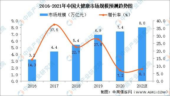 預計2021年我國大健康市場規模可達8.0萬億元,增長幅度為8.1%。尤其是國內老齡化加速,在未來幾年,它是一個市場規模高達幾十萬億的巨型蛋糕。