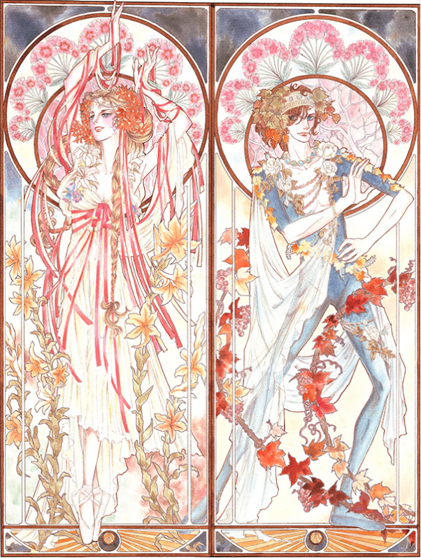談及穆夏,山岸涼子説:**“日本漫畫由手冢治虫開創,而其中的少女漫畫,則得益於日本設計藝術黎明期所受到的穆夏的影響。”**這一看法讓我們又回到大塚英志的觀點。他認為,如果説手冢治虫的漫畫在一定程度上起源於 “米奇式畫法”的話,那少女漫畫的源頭之一就可以歸納為“穆夏式畫法”。而24年組及其繼承者們的少女漫畫,就是對日本近代女性文學將“內心與身體”的發現同“穆夏式畫法”結合起來的昔日傳統的復興。