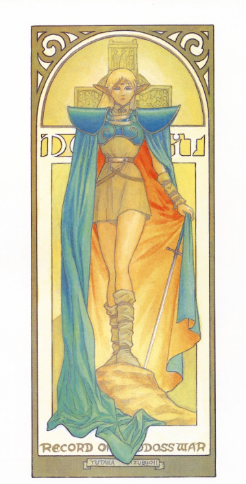 《羅德島戰記》最早是由水野良於上世紀80年代末創作的幻想小説,後來被改編成遊戲、動畫、漫畫等多種媒體產品。而追溯這一系列的視覺化過程,最功不可沒的人就是出渕裕,他不僅擔當了原作小説封面和插圖的繪製工作,還參與了遊戲和動畫的角色原案。而在他對於《羅德島戰記》的設計中,同樣可以看到穆夏的鮮明印記。