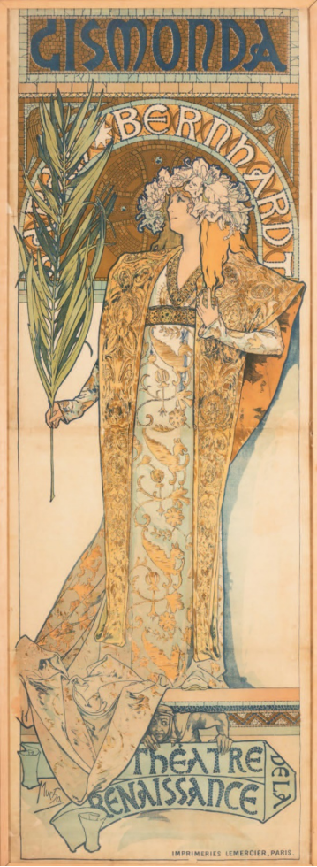 1894年,穆夏為當時最炙手可熱的女演員莎拉·伯恩哈特繪製了新戲**《Gismonda》**的海報。海報中的伯恩哈特身着華服,頭戴花冠,面容姣好,體態柔美。馬賽克樣式的背景和文字以規整的幾何造型鋪於底層,和人物及人物手中的植物共同形成令人愉悦的構圖效果。柔和的平塗色彩則和粗細混用的別緻曲線相得益彰,賦予畫面以日本版畫式的裝飾美感。
