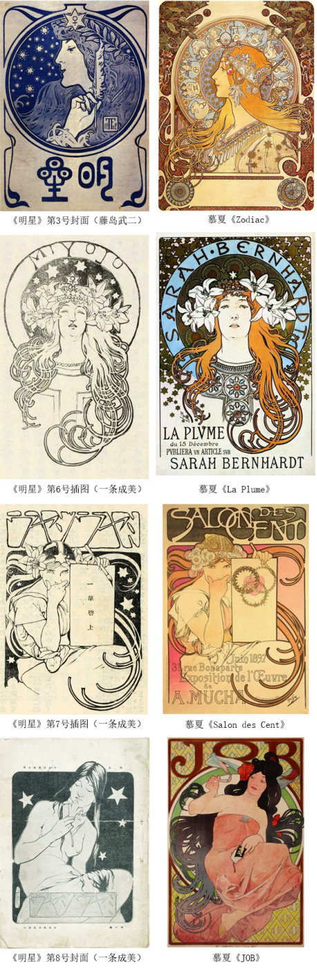 值得一提的是這本雜誌的封面與插圖。負責雜誌美術的兩位畫師藤島武二和一條成美在創作時大量挪用穆夏的圖式和元素,對“穆夏風格”在日本的擴散起到了至關重要的作用。